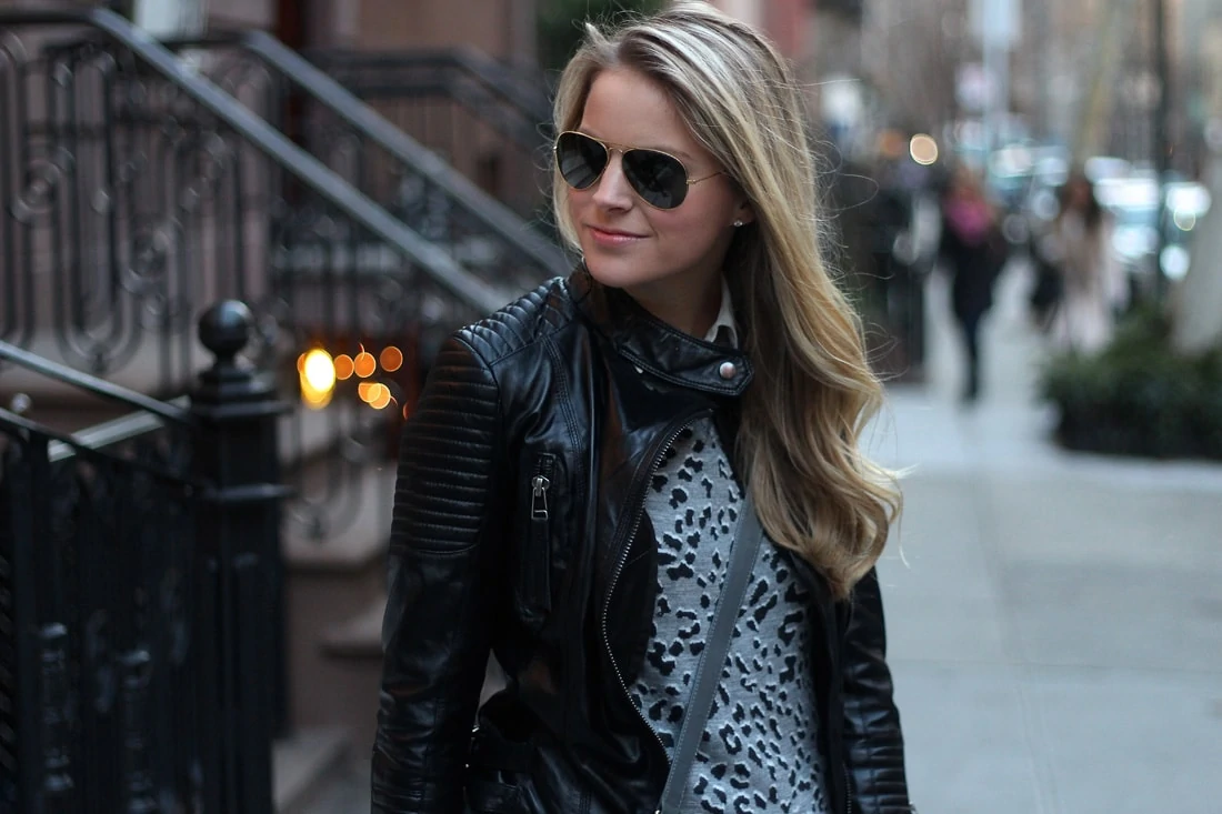Leopard Print Dress // White Blouse // Leather Jacket c/o // Booties // Elaine Turner Bag, old (similar) // Aviators